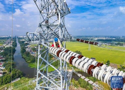 ↑10月1日,在江苏省扬州市江都区吴桥镇,电力人员在扬州-镇江±200千伏直流输电二期工程施工现场作业(无人机照片)。新华社发(任飞摄)