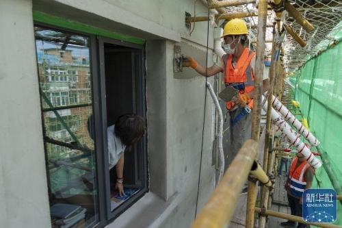 ↑10月1日,在北京东城区和平里街道,中建三局集团有限公司工人进行外墙保温板抗裂砂浆施工。新华社记者 才扬 摄