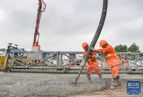 ↑10月1日,在浙江省金华市甬金衢上高速公路金华城区段工地,施工人员在浇筑混凝土。新华社发(时宽兵摄)