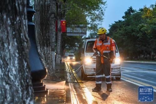 ↑10月1日,河北省石家庄市新华区环卫工人在中华大街进行道路晨扫工作。新华社发(梁子栋摄)