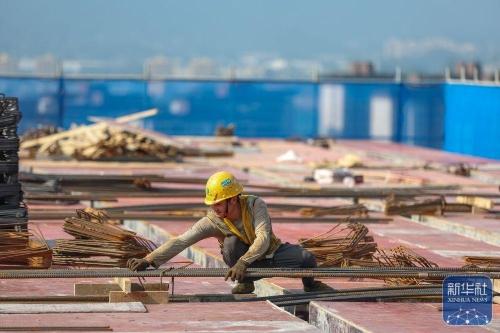 ↑10月1日,工人在贵州省黔西市一建筑工地进行钢筋焊接作业。新华社发(范晖摄)
