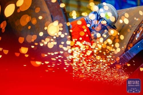 ↑10月1日,在湖南省衡阳市衡山县经济开发区,恒岳重钢钢结构工程有限公司员工进行风电塔筒的部件加工作业。新华社发(曹正平摄)