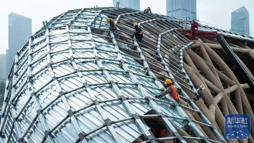 ↑10月1日,在江苏省无锡市奥体中心三期项目现场,中建二局工人对钢结构进行防火涂料喷涂作业。新华社发(朱吉鹏摄)