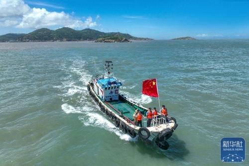 ↑10月1日,浙江省舟山市岱山县公安局罗家岙派出所民警开展海上巡查(无人机照片)。新华社发(邹训永摄)