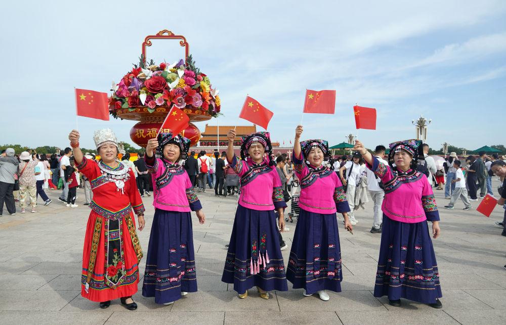 10月1日,来自贵州的游客在北京天安门广场游览拍照。