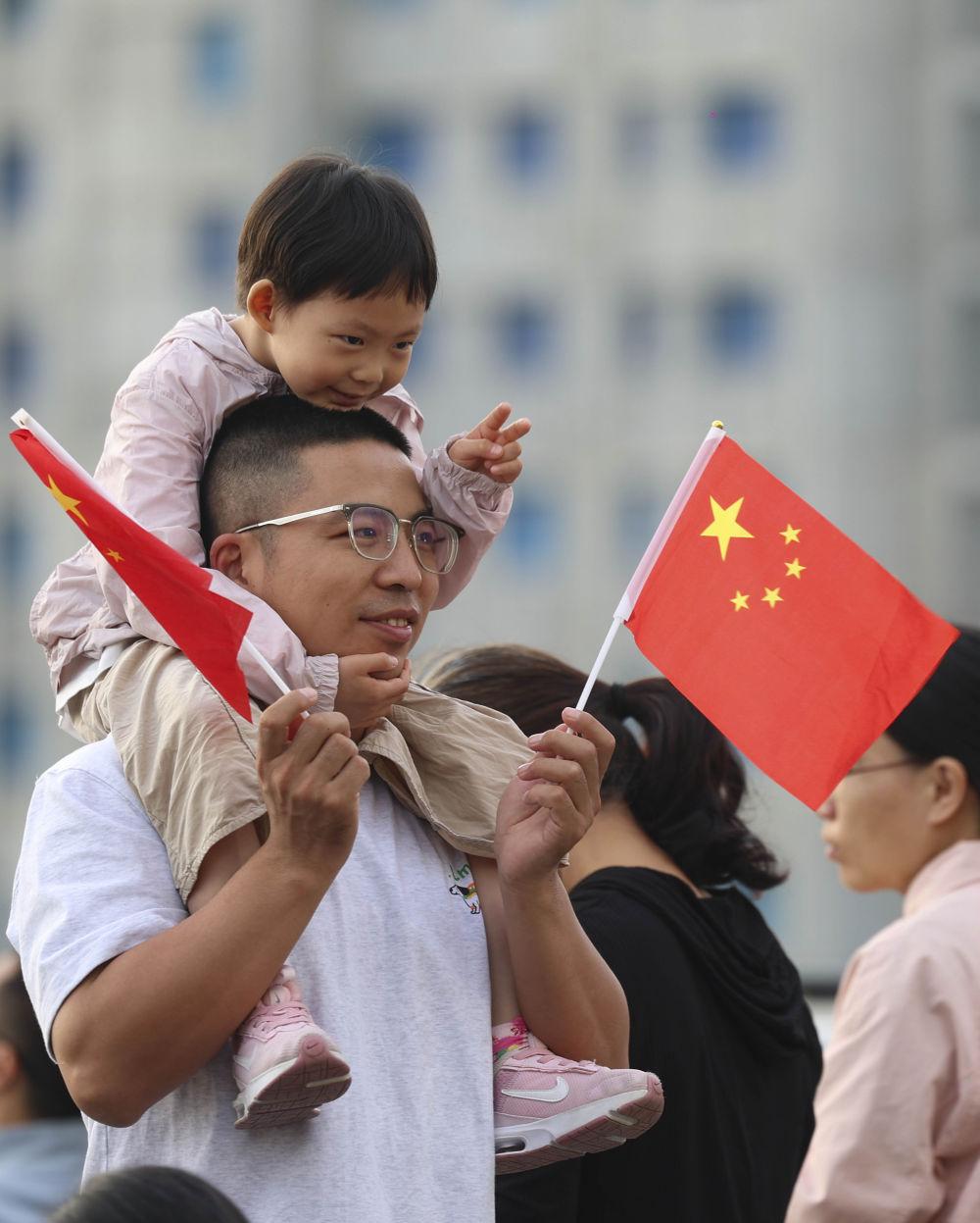 10月1日,在上海中共一大纪念馆,一名小女孩坐在爸爸的肩膀上观看升旗。