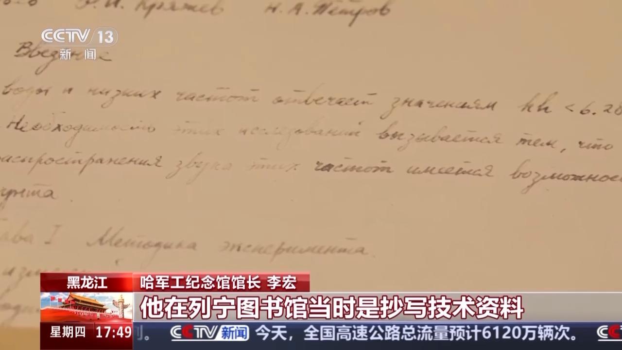 哈军工纪念馆馆长 李宏:这是杨士莪院士用4种语言写的一份科研手稿,1956年杨士莪院士到苏联去留学,他在列宁图书馆抄写技术资料,我们也曾问过院士为什么要用4种语言来抄写这样技术资料?他说只有掌握语言,才能够精准地掌握最前沿的技术资料。