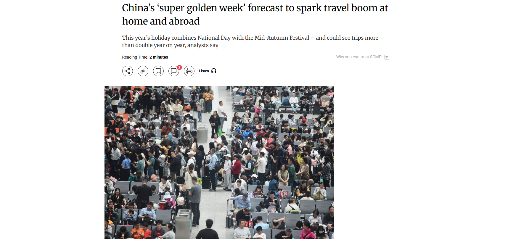 《南华早报》的报道称,在本周开始的超长假期期间,一些免签政策和中国国内高速免费预计将推动出游人数激增,这对服务业经济是一个利好。报道还指出,今年的假期将国庆和中秋节结合在一起,旅游人数可能会比去年增加一倍以上。