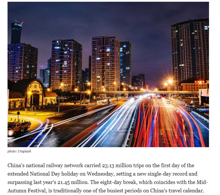 欧洲《现代外交》网站刊文指出,中国十一假期首日,全国铁路网运送了约2313万人次,创造了新的单日纪录,超过了去年的约2145万人次。文章称,创纪录的旅游人数被视为全球第二大经济体消费需求和经济健康状况的晴雨表。