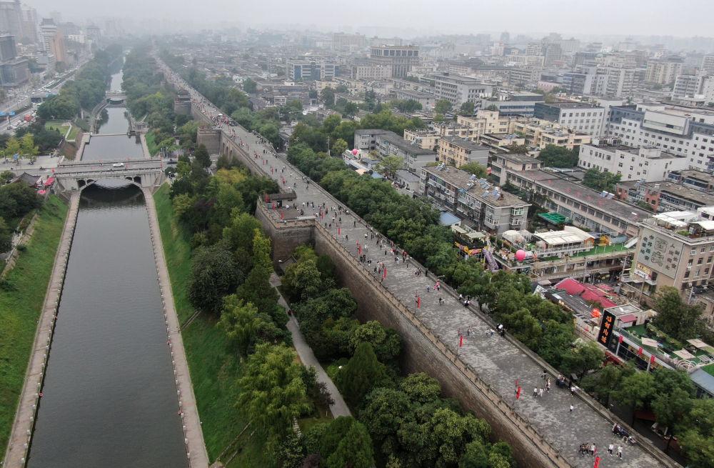 10月3日,游客在西安城墙景区参观(无人机照片)。新华社记者 李一博 摄