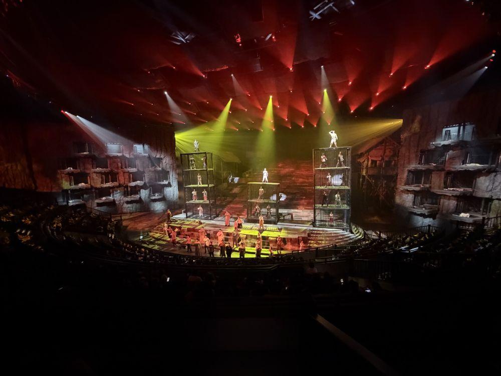 上一秒还是重庆熙攘的街头巷陌,随着舞台和观众席的缓缓旋转,场景无缝切换至渣滓洞监狱。“枪声”从耳畔掠过,座椅随“炮声”震颤,灯光模拟出天边破晓和熊熊火光……观众仿佛被拉回到1949年的山城。
