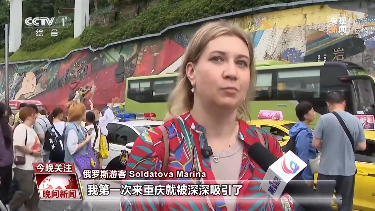 俄罗斯游客 Soldatova Marina:我第一次来重庆就被深深吸引了,后续肯定会邀请客人来重庆,因为重庆是一个非常有潜力的现代化大都市,不仅有美丽的自然风光,还有许多人文景观。