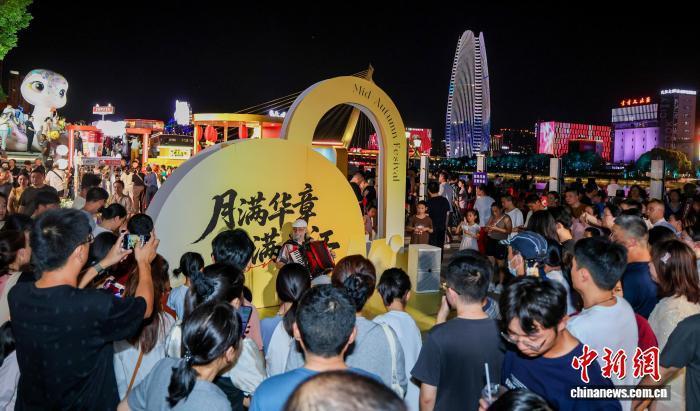 10月6日晚,悠扬的手风琴在浙江宁波老外滩响起。