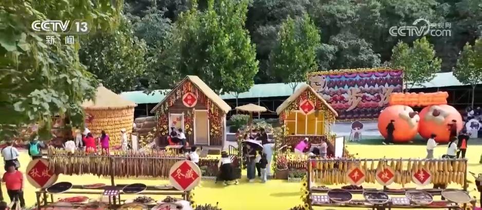 跟随镜头,我们一起来到位于西部太行山区的河北武安市七步沟景区,一场以“秋山草堂·晒秋场”为主题的传统晒秋活动正在举行,数十种太行山原生农作物沿山势铺展:火红的辣椒串垂挂在晒架下,串串饱满;金黄的玉米棒堆成小山,颗粒分明;橙红的柿子与竹匾里晾晒的南瓜、核桃、花生相映成趣,构成一幅色彩浓烈的秋日丰收图。国庆假期,景区日均接待游客量较平日增长3倍。