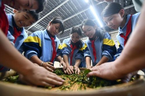 2024年12月3日,学生们在广西梧州市苍梧县六堡镇塘平小学学习制作六堡茶。广西六堡茶已有1500多年的历史,其制作工艺被列入第四批国家级非物质文化遗产代表性项目名录。近年来,广西围绕打造千亿元茶产业发展目标,深入实施绿色高效茶园建设、品牌提升和营销体系建设、产业融合和茶文化提升等多项工程,形成了以六堡茶为引擎,早春茶等特色优势茶协同发展的产业格局,茶产业焕发勃勃生机。六堡茶正沿21世纪海上丝绸之路运达八方,香飘海内外。2024年,广西六堡茶产量达到4.3万吨,综合产值超300亿元。