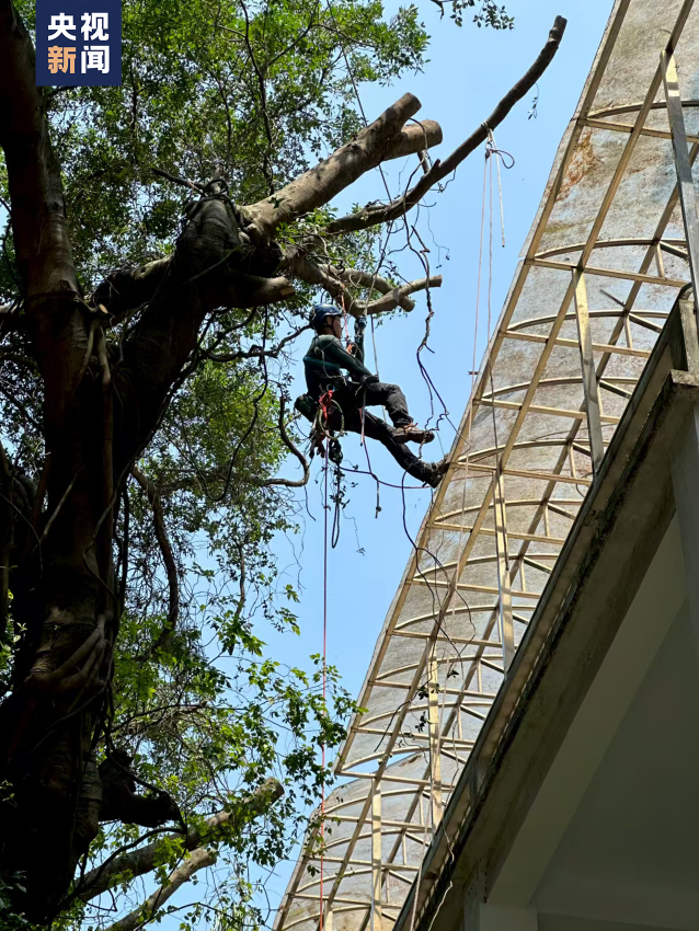 台风来临前,攀树师会提前评估高大树木的状况,适当修剪枝条,防止树木倒伏,保障居民安全。