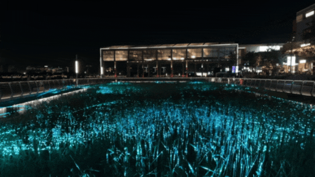 用变色激光模拟夏末萤火虫舞动,让江畔步道及周边商业笼罩萤火星海,营造浪漫夜色,吸引人流驻足。