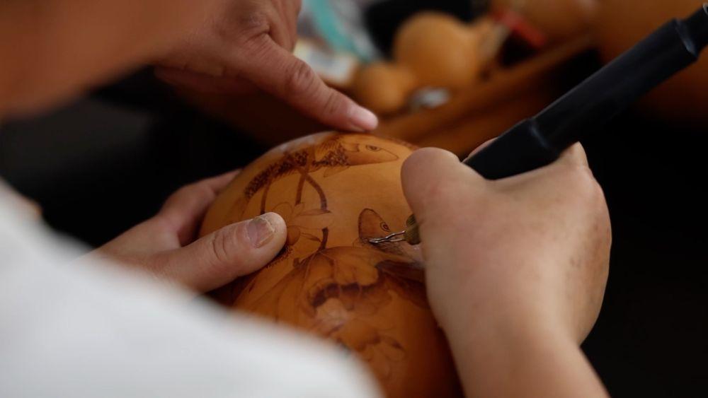 金秋10月,天津市滨海新区太平镇的田野间,连片葫芦地迎来丰收。在太平葫芦特色产业园加工车间,工匠们以铁为笔,在葫芦上勾勒出精细的山水、花鸟或福禄图案。经过打磨、烙画、抛光等工序,普通葫芦价值得到大幅提升。