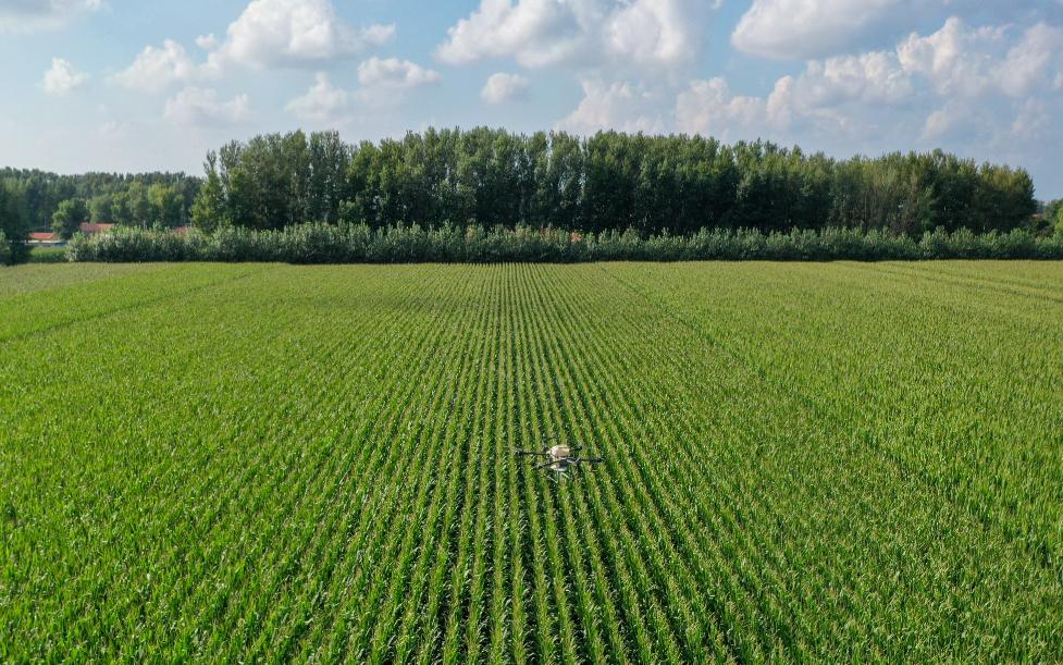 7月21日,在位于吉林省四平市梨树县的“科技小院”试验田,植保无人机为玉米精准施肥(无人机拍摄)。新华社记者 张楠 摄