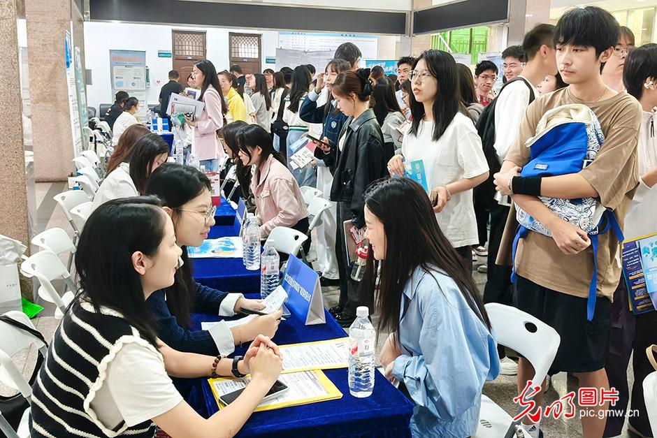 江苏省2026届高校毕业生秋季招聘月暨南京医科大学康达学院专场招聘会举行,来自医药行业的60余家单位为2026届毕业生提供1700余个岗位。招聘现场人头攒动,毕业生们纷纷前往自己心仪的工作单位咨询洽谈。(朱德富摄/光明图片)
