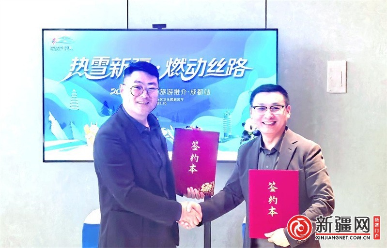 10月17日,“疆途有约”2025新疆冬季文旅对接洽谈会(成都)签约现场。图为新疆海洋国际旅行社(有限公司)代表(左)与四川省锦途国际旅行社有限公司代表签订战略合作协议。(薛玲摄)