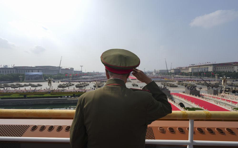 9月3日,纪念中国人民抗日战争暨世界反法西斯战争胜利80周年大会在北京隆重举行。这是观礼嘉宾在天安门城楼上敬礼。新华社记者 才扬 摄