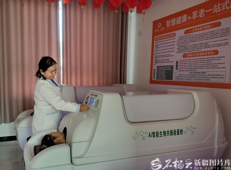 10月24日,库车市城南街道禧源社区日间照料中心,居民接受AI智能生物共振能量舱理疗。王红丽摄