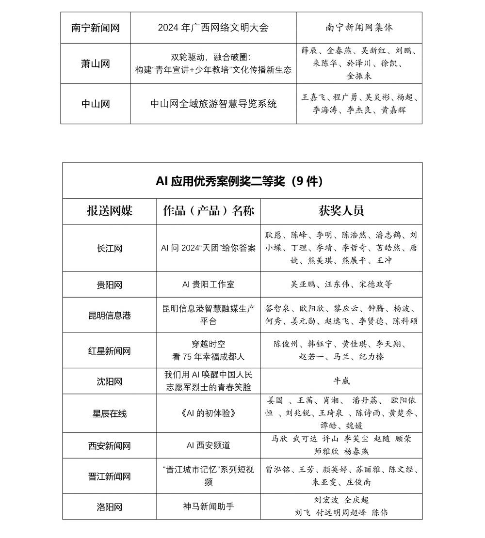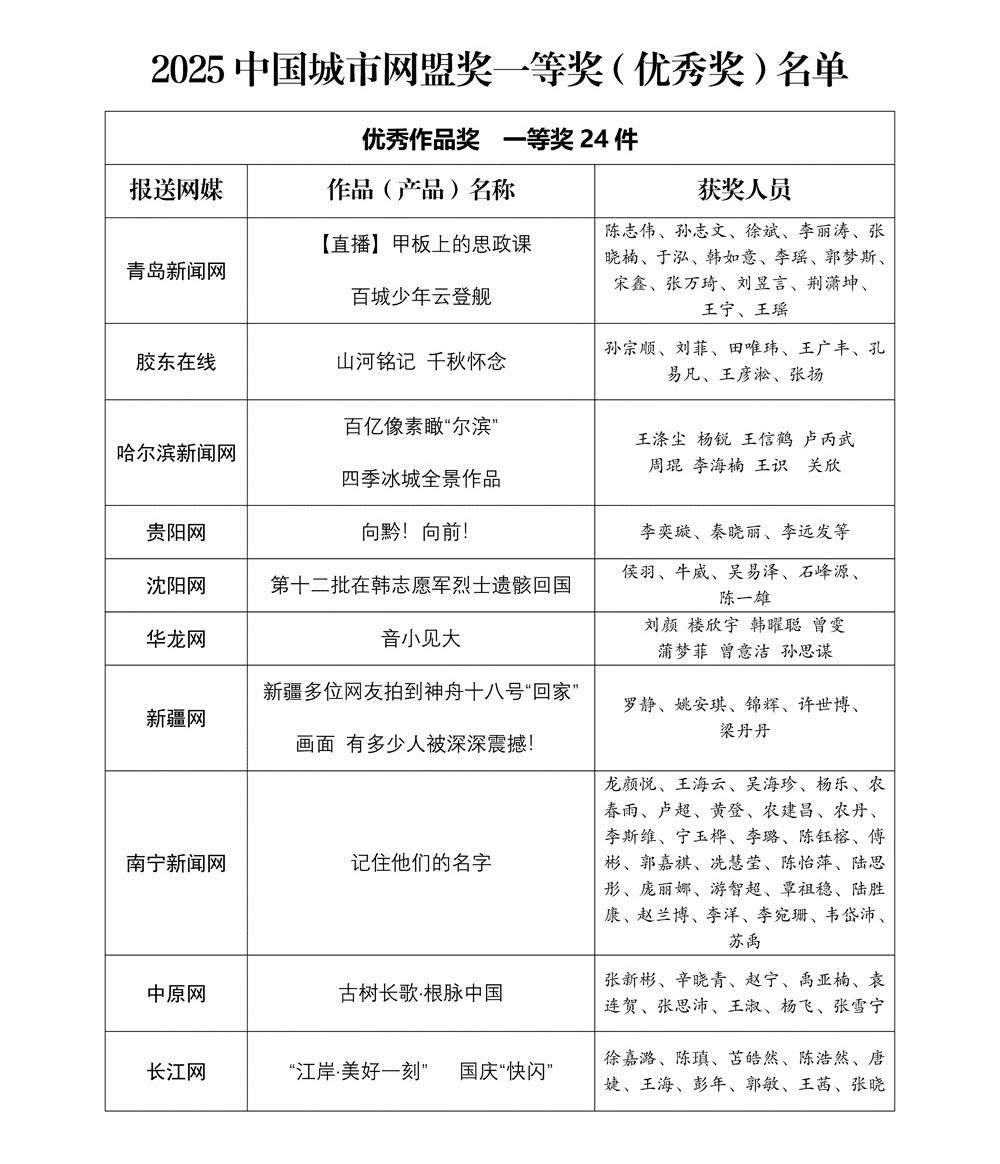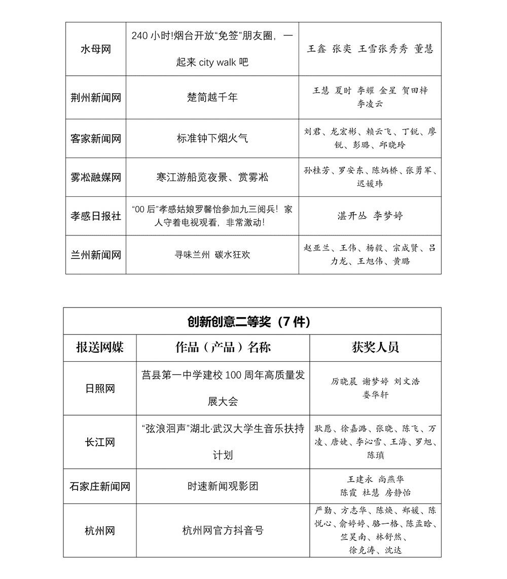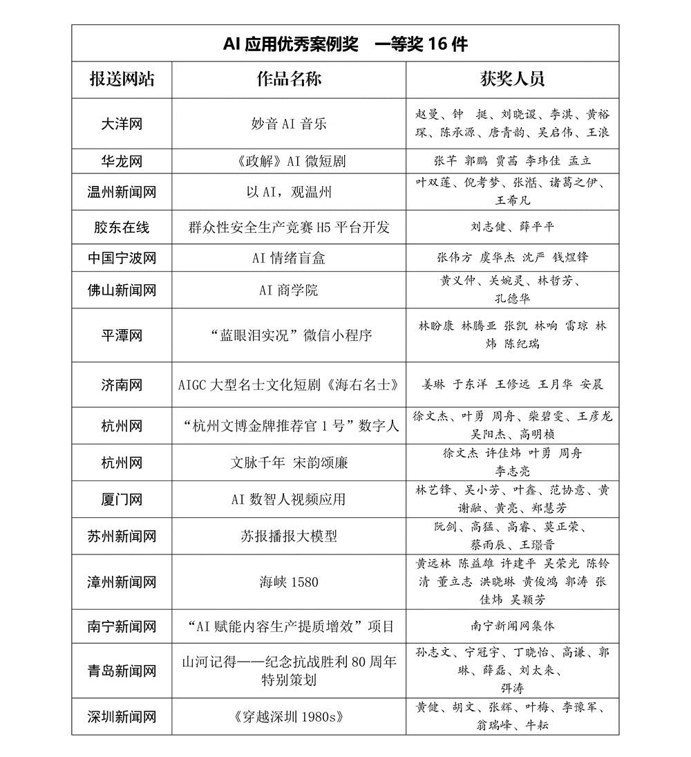青岛新闻网《甲板上的思政课 百城少年云登舰》等24件作品获“优秀作品/产品奖”一等奖;深圳新闻网《“咏春·咏敢·咏创”深圳经济特区建立45周年特别直播》等19件作品获“创新创意奖”一等奖;大洋网《妙音AI音乐》等16件作品获“AI应用优秀案例奖”一等奖;杭州网徐洁等7人获“年度人物奖”;华龙网等5家网媒获“优秀城市网媒奖”。一件件优秀作品、一个个创新创意,展现了全国城市网媒创新发展的鲜活实践。