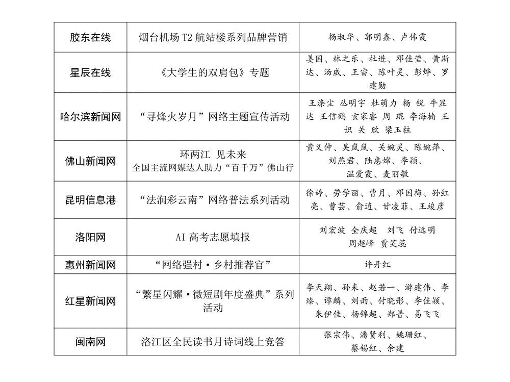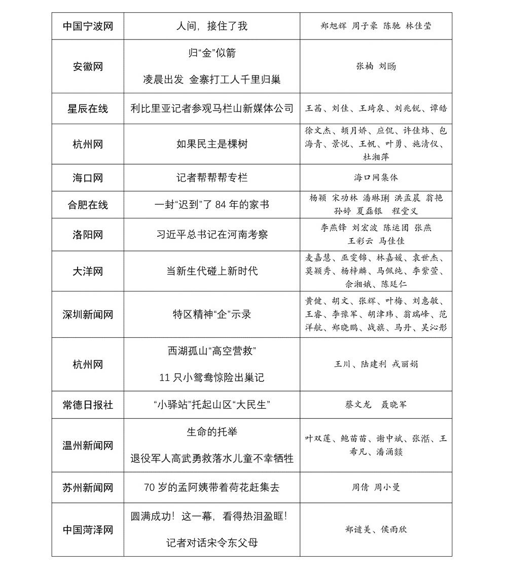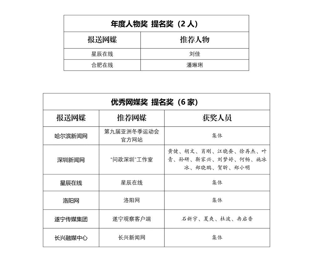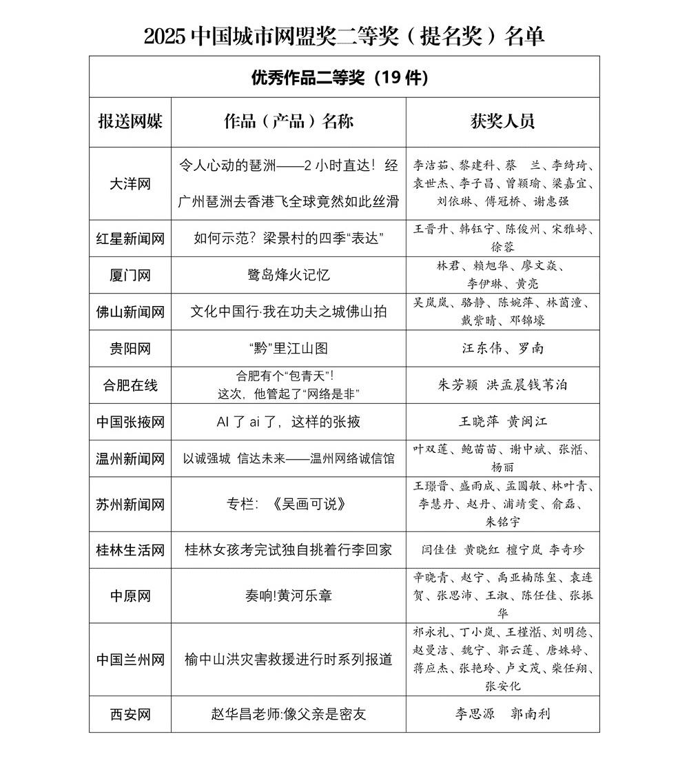 青岛新闻网《甲板上的思政课 百城少年云登舰》等24件作品获“优秀作品/产品奖”一等奖;深圳新闻网《“咏春·咏敢·咏创”深圳经济特区建立45周年特别直播》等19件作品获“创新创意奖”一等奖;大洋网《妙音AI音乐》等16件作品获“AI应用优秀案例奖”一等奖;杭州网徐洁等7人获“年度人物奖”;华龙网等5家网媒获“优秀城市网媒奖”。一件件优秀作品、一个个创新创意,展现了全国城市网媒创新发展的鲜活实践。