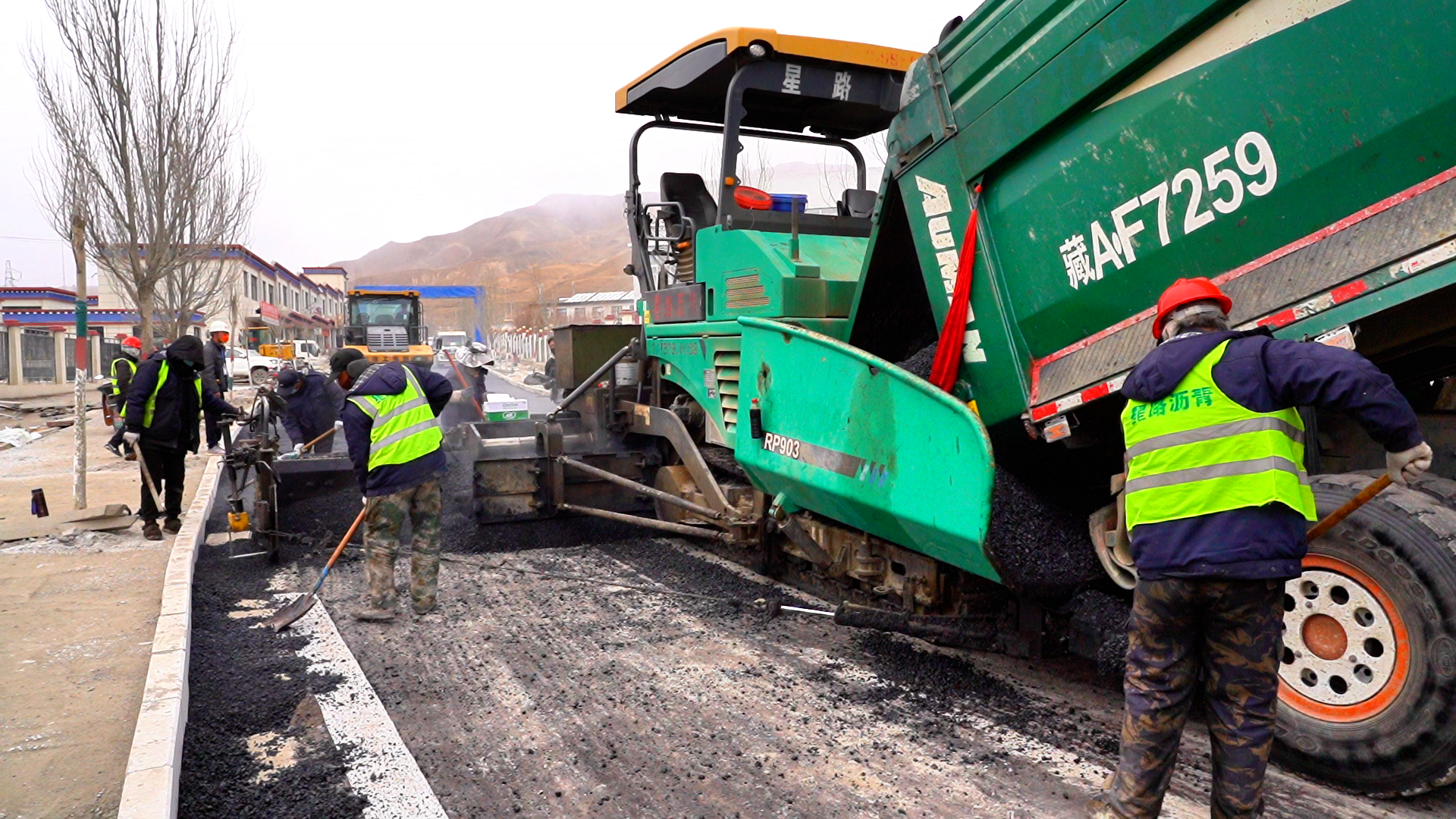 图为工人正在给措美县城巴尔林路铺油。措美县委宣传部供图