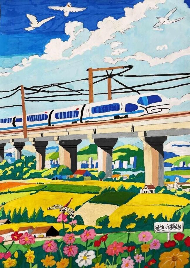 不远处徐盐高铁上,银白色的高铁像一道流星划过水乡。我的铅笔在本子上沙沙作响,把窗外的景色画下来:成片的藕田里,粉白的荷花摇曳生姿;戴着斗笠的农民在稻田里忙碌,身后的水渠泛着粼粼波光。列车员阿姨推着小推车走来,“瓜子饮料矿泉水”的吆喝声,和车轮与钢轨的碰撞声交织在一起,成为独属于旅途的音乐。