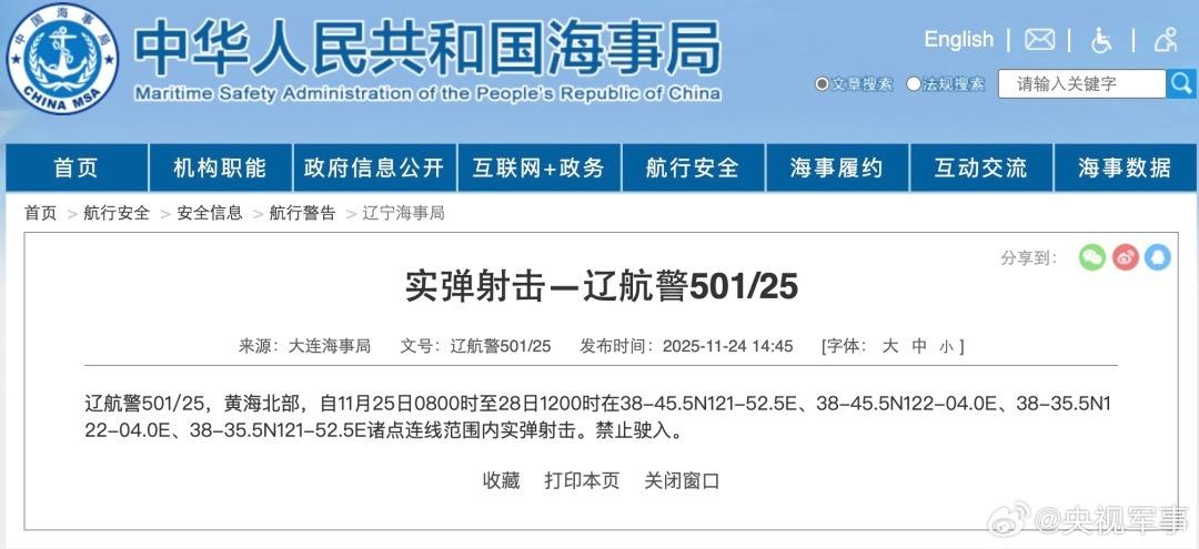 据中国海事局网站消息,大连海事局发布航行警告,11月25日8时至28日12时,黄海北部部分海域实弹射击,禁止驶入。