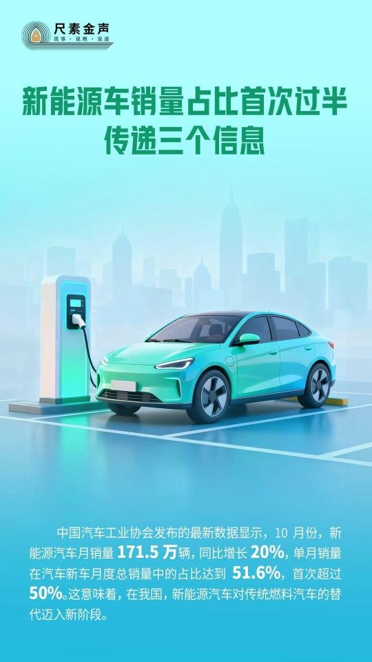 中国汽车工业协会发布的最新数据显示,10月份,新能源汽车月销量171.5万辆,同比增长20%,单月销量在汽车新车月度总销量中的占比达到51.6%,首次超过50%。这意味着,在我国,新能源汽车对传统燃料汽车的替代迈入新阶段。