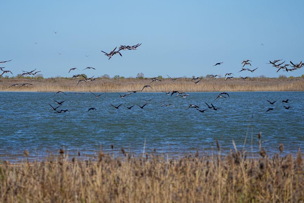 2025年11月13日,越冬候鸟在山东黄河三角洲国家级自然保护区飞翔。新华社记者 朱峥 摄