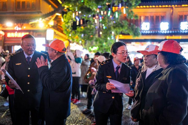 2023年5月18日,一名游客(左)在丽江古城向志愿者咨询。2015年12月,云南丽江古城保护管理局牵头成立了丽江古城旅游志愿者服务队,志愿者主要来自市区机关单位、古城保护管理局、古城经营户、在校学生、社区居民等,常年在古城内提供旅游咨询、道路指引、文明引导等志愿服务。