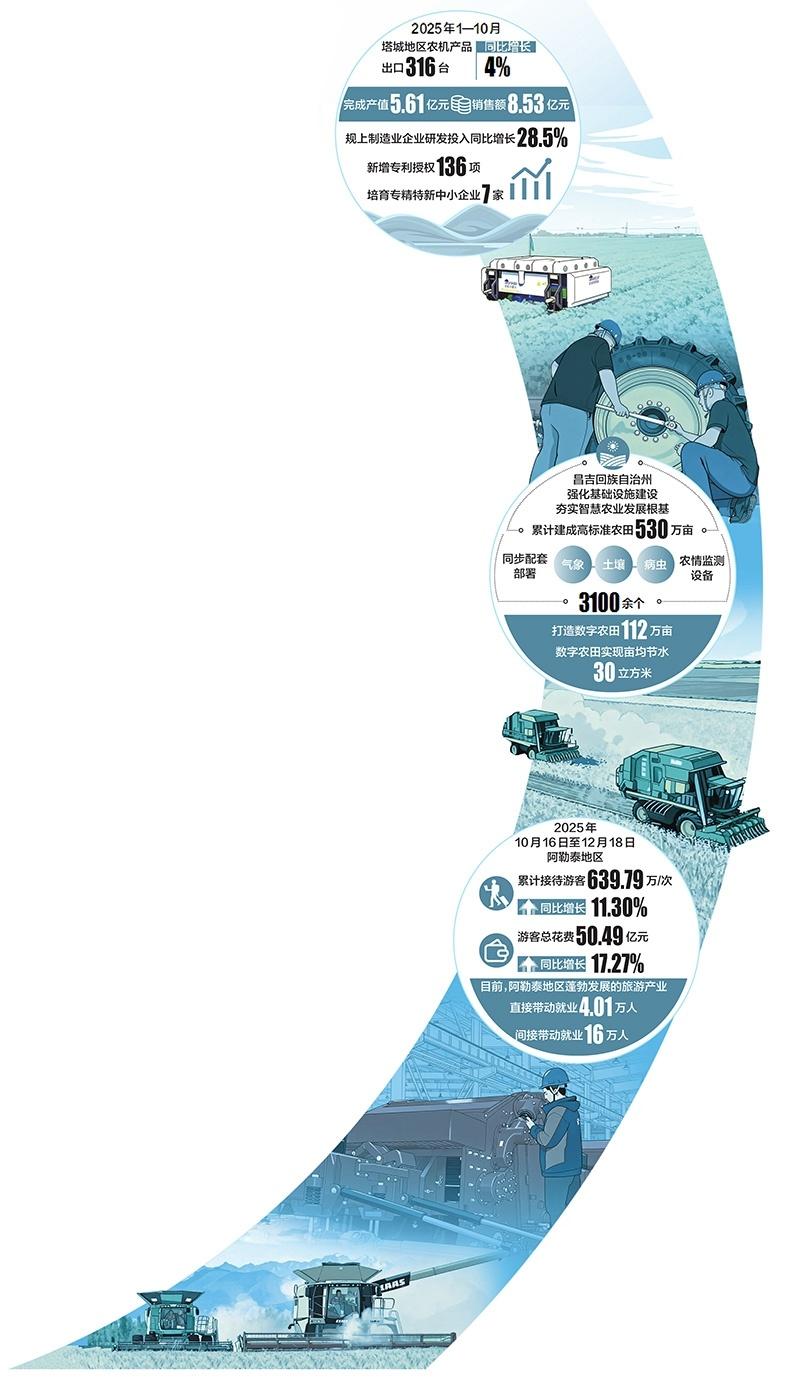 岁末之际,北疆大地处处涌动着蓬勃生机与创新活力。从智能农机产销两旺到数字农田“云端”管理,从冰雪热潮点燃消费新引擎到物流枢纽贯通能源动脉,一幅以“新”为底色的发展画卷正徐徐展开。本期北疆观察版年终盘点,聚焦四组生动实践,看新技术、新产业、新模式如何汇聚成新质生产力,为区域高质量发展注入强劲动能。