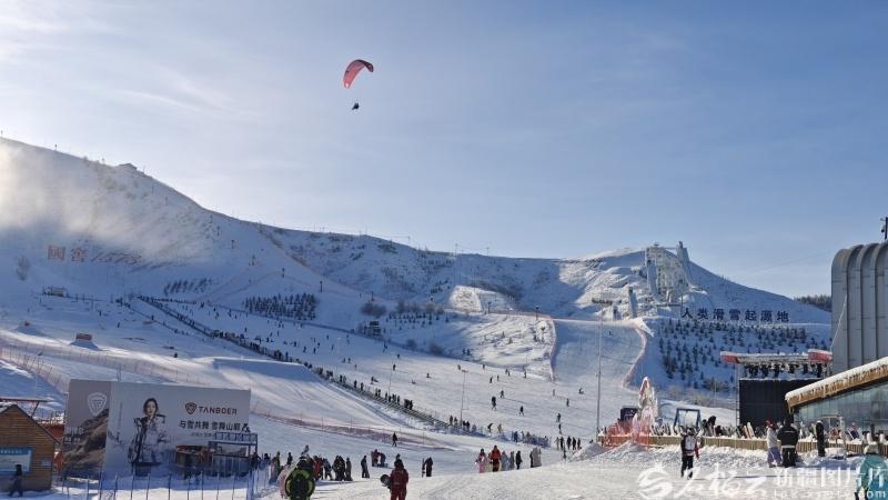 银雪之上,滑翔伞驭风漫舞、滑雪者踏雪飞驰,将军山国际滑雪度假区的冰雪天地满是热血与自由。石榴云/新疆日报记者 张婷摄