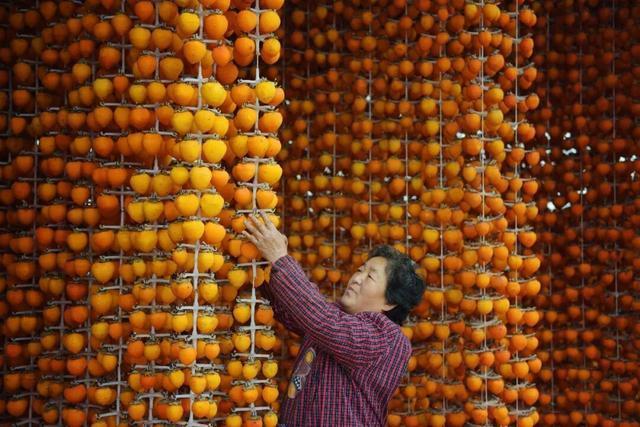 陕西省富平县曹村镇太白村村民在晾晒柿子。新华社记者 刘潇 摄