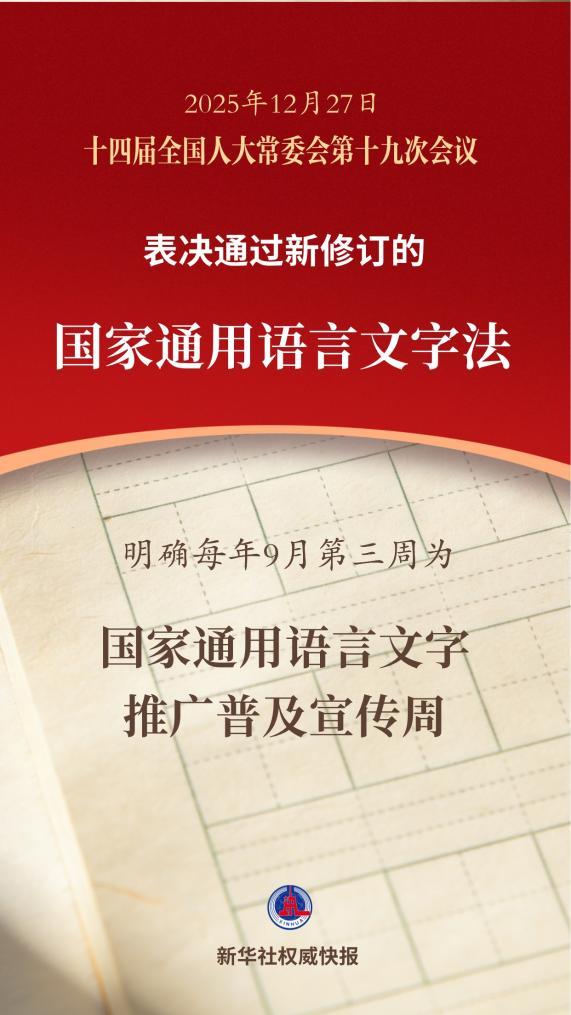 新华社北京12月27日电 十四届全国人大常委会第十九次会议12月27日表决通过新修订的国家通用语言文字法,明确每年9月的第三周为国家通用语言文字推广普及宣传周。