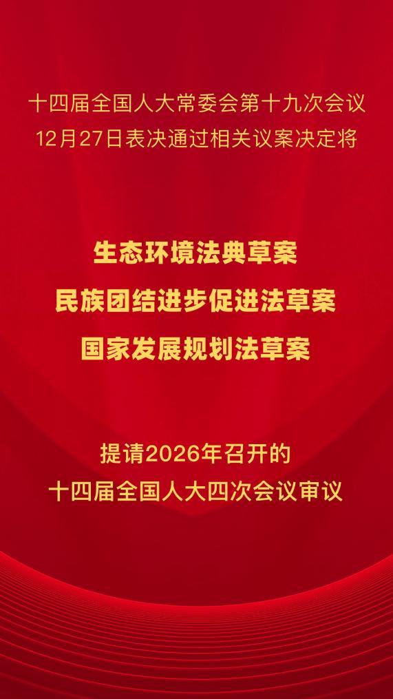新华社北京12月27日电 十四届全国人大常委会第十九次会议12月27日表决通过相关议案,决定将生态环境法典草案、民族团结进步促进法草案、国家发展规划法草案提请明年召开的十四届全国人大四次会议审议。