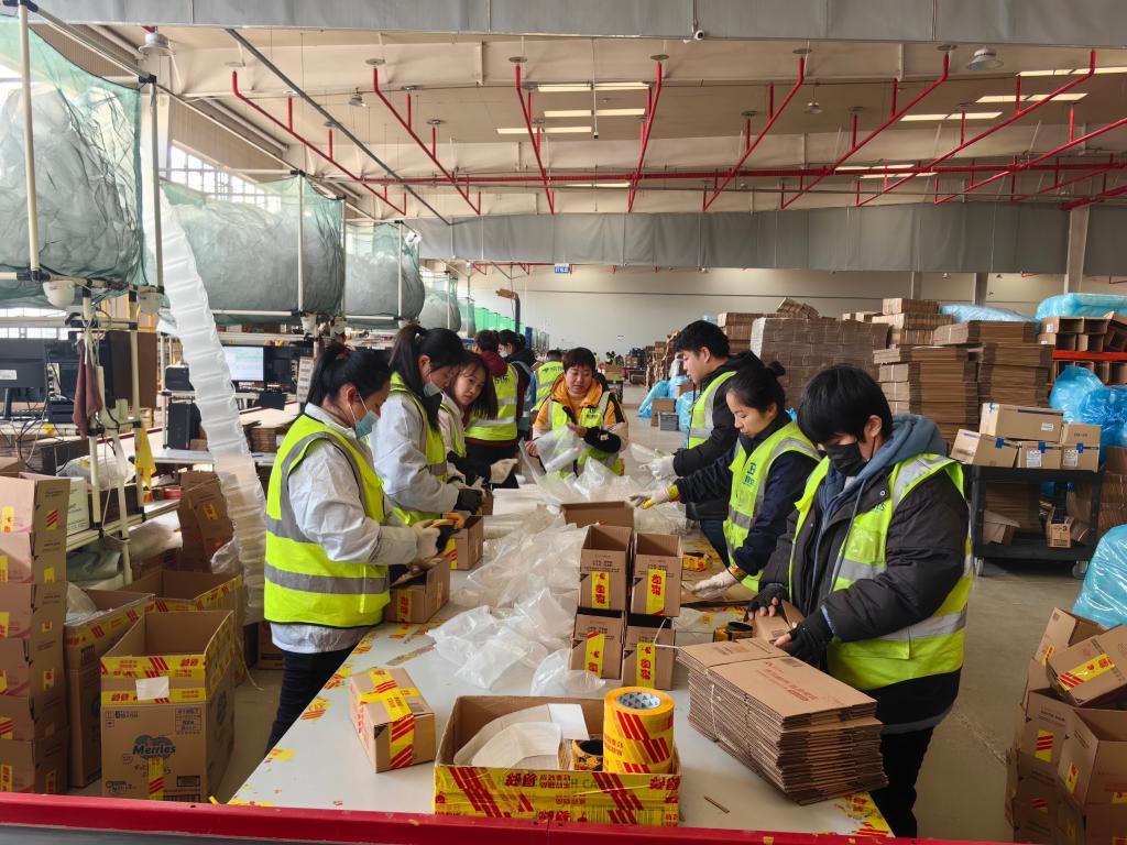 1月22日,在位于山东烟台的日韩消费品跨境电商中心京东综合仓内,工作人员将货物分拣、打包。新华社记者 邵琨 摄