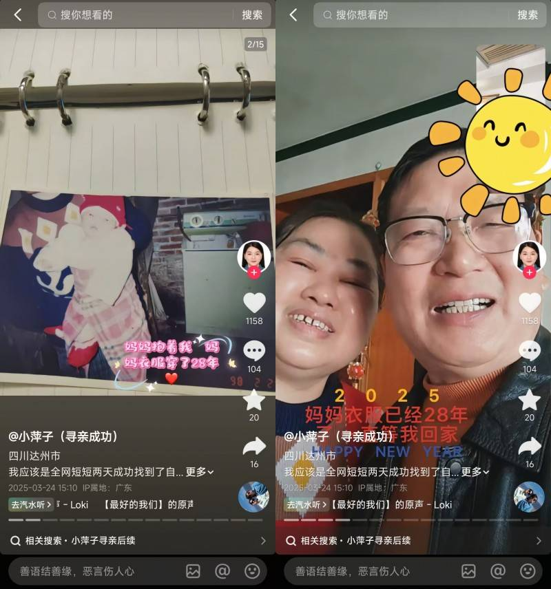 “28年后的今天,我找到家了”,3月24日,28岁的广东河源紫金县女孩小萍(化名)在抖音发布一条“父母找到了”的“喜报”。