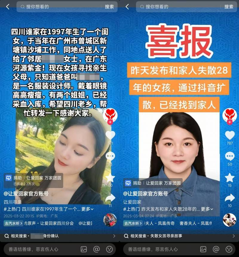 前段时间,小萍刷抖音时看到了深圳被拐男孩谢浩楠和父母相认的热门事件,也萌生了通过抖音寻找亲生父母的想法。她先是自己发了两条寻亲视频,又联系了抖音寻人合作的志愿者@让爱回家官方账号和@团圆助力官邻水甘彪。得知小萍的寻亲需求后,@让爱回家官方账号 3月22日晚接连发布了两条寻亲视频,介绍了小萍被送养的时间、地点、中间人姓名、亲生父亲的姓名和籍贯等信息。@团圆助力官邻水甘彪 也发布了寻亲视频,为小萍提供帮助。