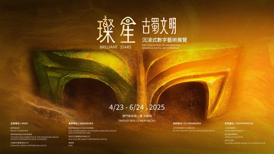 4月23日,一场融合数字艺术、互动科技与考古叙事的沉浸式展览—— “璨星——古蜀文明沉浸式数字艺术展览”,在澳门美高梅百宝箱盛大开幕,展览于4月24日正式面向公众开放,持续至6月24日。本次展览由澳门基金会、横琴粤澳深度合作区执行委员会和中国保利集团联合主办,由横琴粤澳深度合作区民生事务局、保利文化集团及美高梅共同承办。