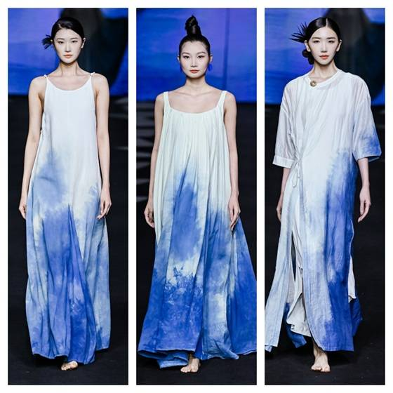 这次非遗大秀服装面料,工艺由手工土布,香云纱,刺绣,植物染制作而成;音乐来自非遗乐器单弦协奏曲《持续》,该作品由作曲家隋晓峰创作,述说非遗乐器单弦与大提琴的对话,非遗乐器单弦,只有一根弦,且是只用一根手指演奏的独特乐器,它不仅能够演奏延绵持续的乐音,亦能惟妙惟肖模仿人类的语言、动物的叫声,是别具一格的中国乐器,而视频背景是墨话团队以陕北窑洞、故宫红、织锦和植物蓝染为灵感用AI辅助创作。