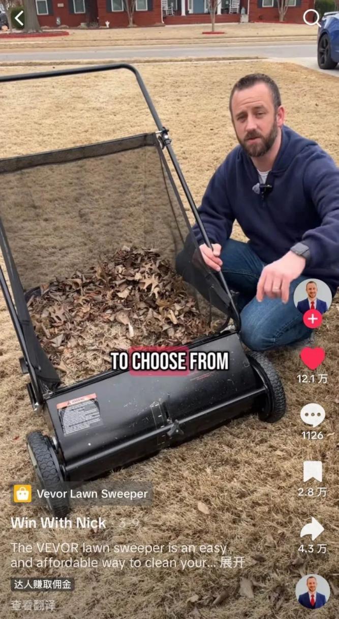 在一条视频中,拥有3万粉丝的家居户外达人Nick推介了Vevor的一款草坪清洁器。他推着清洁器走过后院,所过之处,落叶、松果和杂草瞬间被网兜收入囊中。无需多言,这款清洁器的轻便与高效就已展现在观众面前。