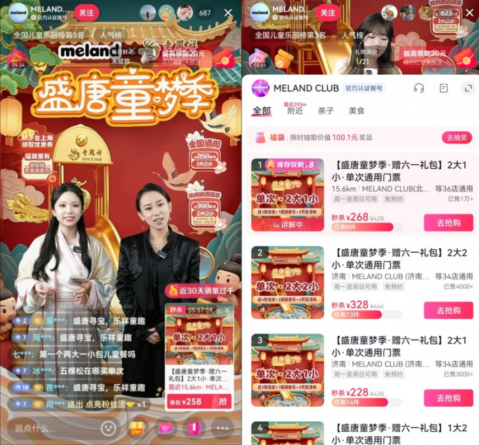 meland作为国内亲子游乐品牌,分布全国60多个城市,有超140家连锁直营乐园门店。其分为两种店型,其中meland店是标准店,拥有精致舒适的游玩空间尺度,位置分布在各大城市的核心购物中心,适合亲子家庭到店体验。meland club店为高端旗舰店,游玩面积更加开阔,拥有国际性视野的场景设计审美,意在打造成为城市的亲子玩乐地标,也是家庭游玩出行的超人气目的地;入园后不限时游玩,配有亲子餐厅、洗手间、母婴室、儿童休息室、派对房等高品质贴心服务配套,还提供一站式儿童生日派对定制。“六一”儿童节来临,meland携手老凤祥共同打造以“盛唐童梦季”为主题的抖音专场直播,针对不同地区的门店上架了2大1小、2大2小、1大2小等多款单次通用门票家庭套餐,折扣力度低至5折。