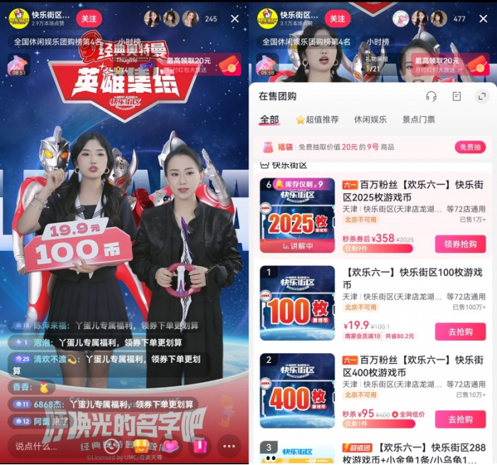作为电玩连锁品牌的快乐街区,线下提供娃娃机、投篮、摩托、街机、赛车等众多游玩项目。活动期间,快乐街区以“经典奥特曼·英雄集结”为主题,上架19.9元团100枚游戏币、95元团400枚游戏币、358元团2025枚游戏币等直播专属商品。由于核销后可以长期使用,多款团购产品一经上架即被抢光。