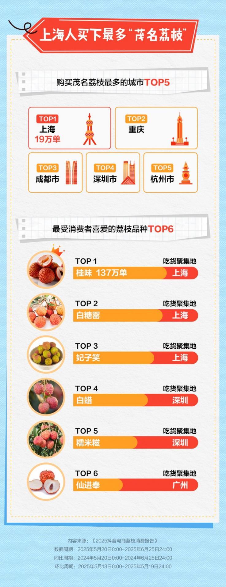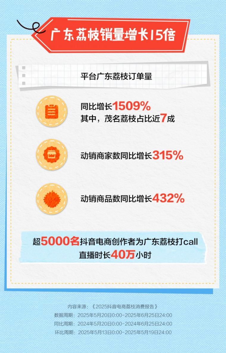 6月30日,抖音电商发布2025荔枝消费报告(下称“报告”),呈现今年夏天平台荔枝销售情况、用户口味偏好等趋势。数据显示,5月20日至6月25日,平台广东荔枝订单量同比增长1509%,单品规模与增速均居行业前列。其中,茂名荔枝占比近7成。