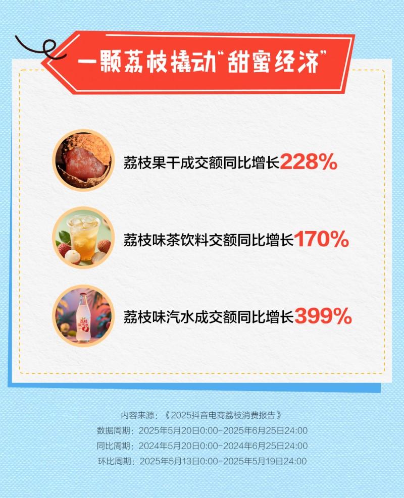 荔枝的爆火还带动荔枝相关产品热销。在抖音电商平台,荔枝果干、荔枝味茶饮料、荔枝味汽水也备受消费者追捧,成交额同比增长228%、170%和399%。